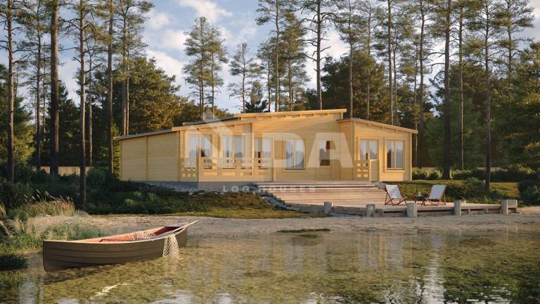 This six rooms residential log home model is designed to exceed your expectations. As you step inside this exquisite Huckleberry Point, you will be amazed by the abundance of natural light that floods the space, creating a warm and inviting atmosphere. Huge windows 78 sq. m of living area turn the house into a magical place. The lovely terrace is all you need to enjoy your getaway.