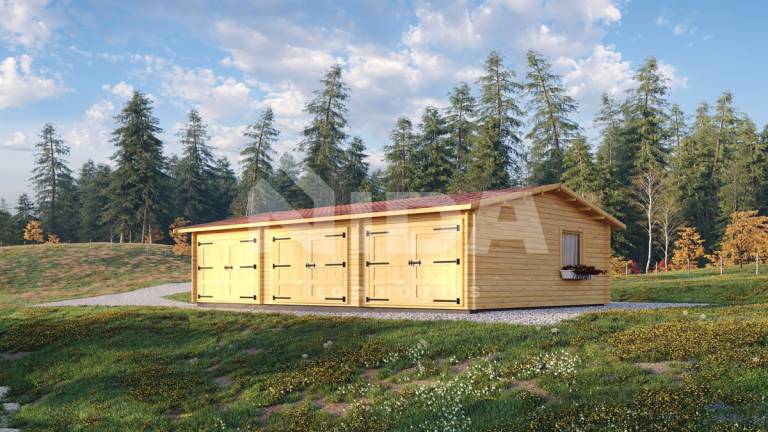 Violet Nook is our largest wooden garage project. Providing almost 49 sq. m of living area, it can perfectly host up to three cars. There is enough space for storing some items as well. Standard log cabin architecture and design will perfectly match the natural surroundings. The model comes with two windows for natural daylight.